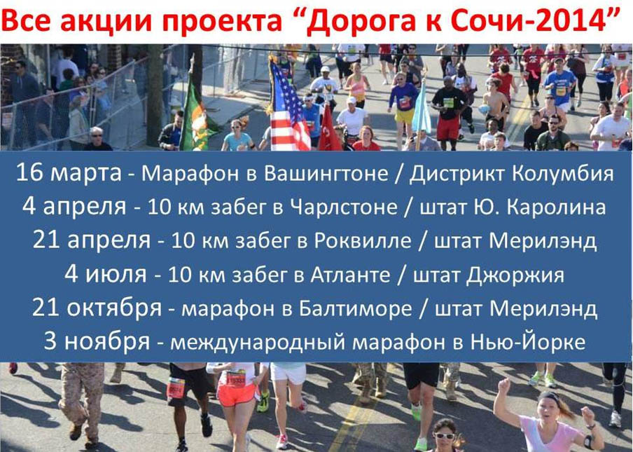 Первая рекламная акция прошла в Вашингтоне 16 марта 2013 года на Rock-n-Roll марафонe, где команда «Дорога к Сочи-2014» начала впервые знакомить американцев с Олимпиадой в Сочи. Все спортсмены и участники проекта были одеты в футболки с надписью «Сочи-2014», что сразу привлекло внимание американских СМИ.