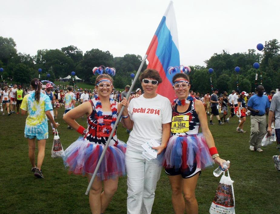 Так как Peachtree Road Race проводится всегда в День Независимости Америки, то в этот день принято одеваться как зрителям, так и его участникам в цвета американского флага — синий, красный, белый! Во время нашей акции в Атланте, когда мы рассказывали о предстоящей Олимпиаде в Сочи, многие американцы подходили к нам и отмечали, что наши патриотические цвета одни и те же — красный, синий и белый, что, конечно же, сближает наши народы!